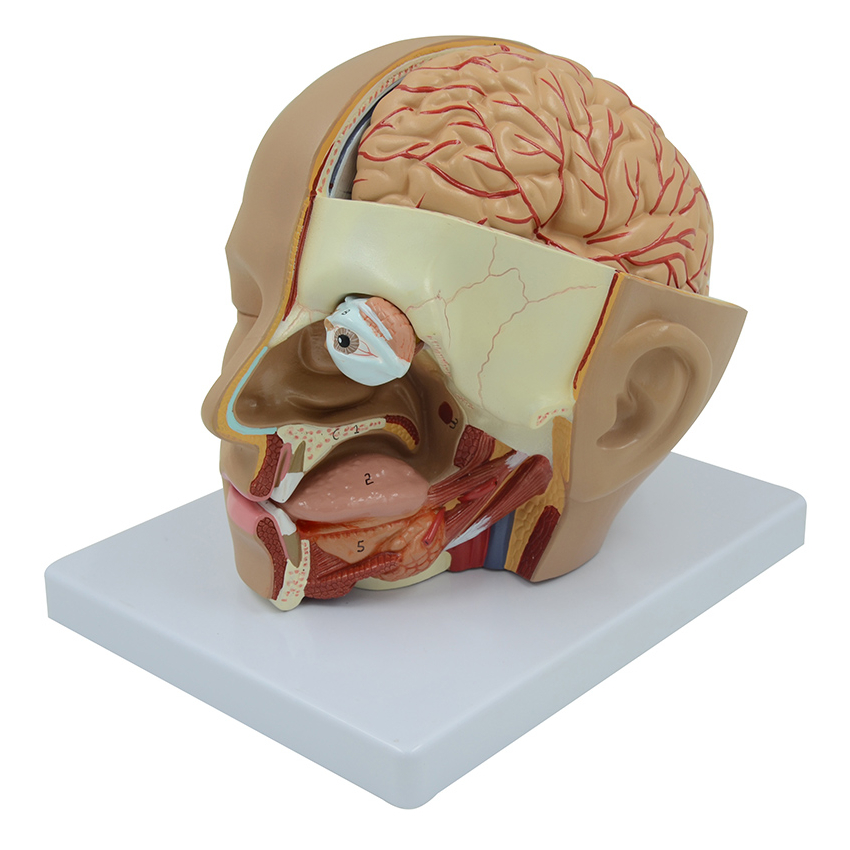 Модель головы в натуральную величину состоит из 4 частей: половина мозга, показывающая внутреннюю структуру головного мозга, включая кровеносные сосуды; половина мозжечка; глаз с зрительным нервом. Правая часть лица рассечена в сагиттальном и горизонтальном направлениях. Разрез, показывающий многие важные внутренние особенности черепа и мозга, а также полость носа. На основании.
