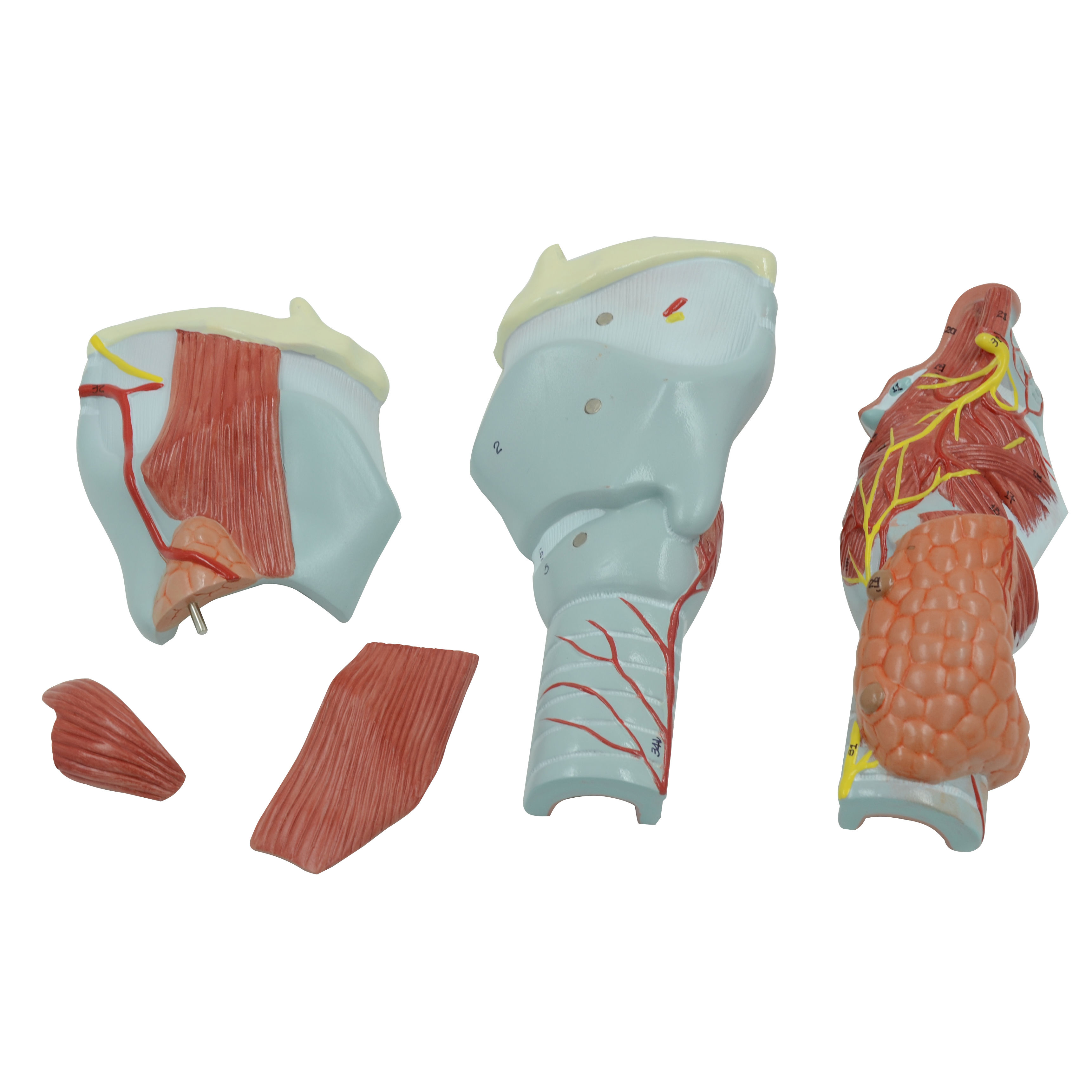 Модель гортани, разборная на 5 частей. Продольное сечение позволяет подробно продемонстрировать внутренние структуры, включая подъязычную кость, хрящи, связки, мышцы, сосуды, нервы, щитовидную железу.