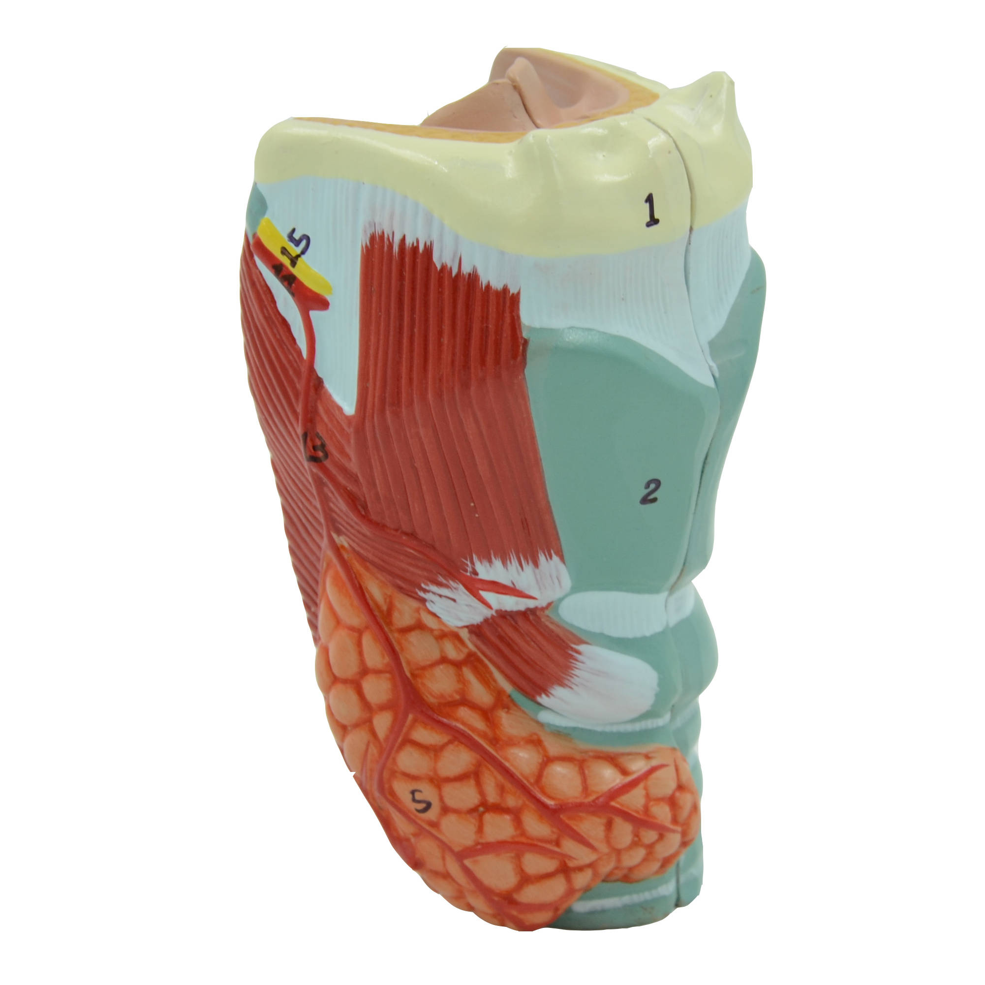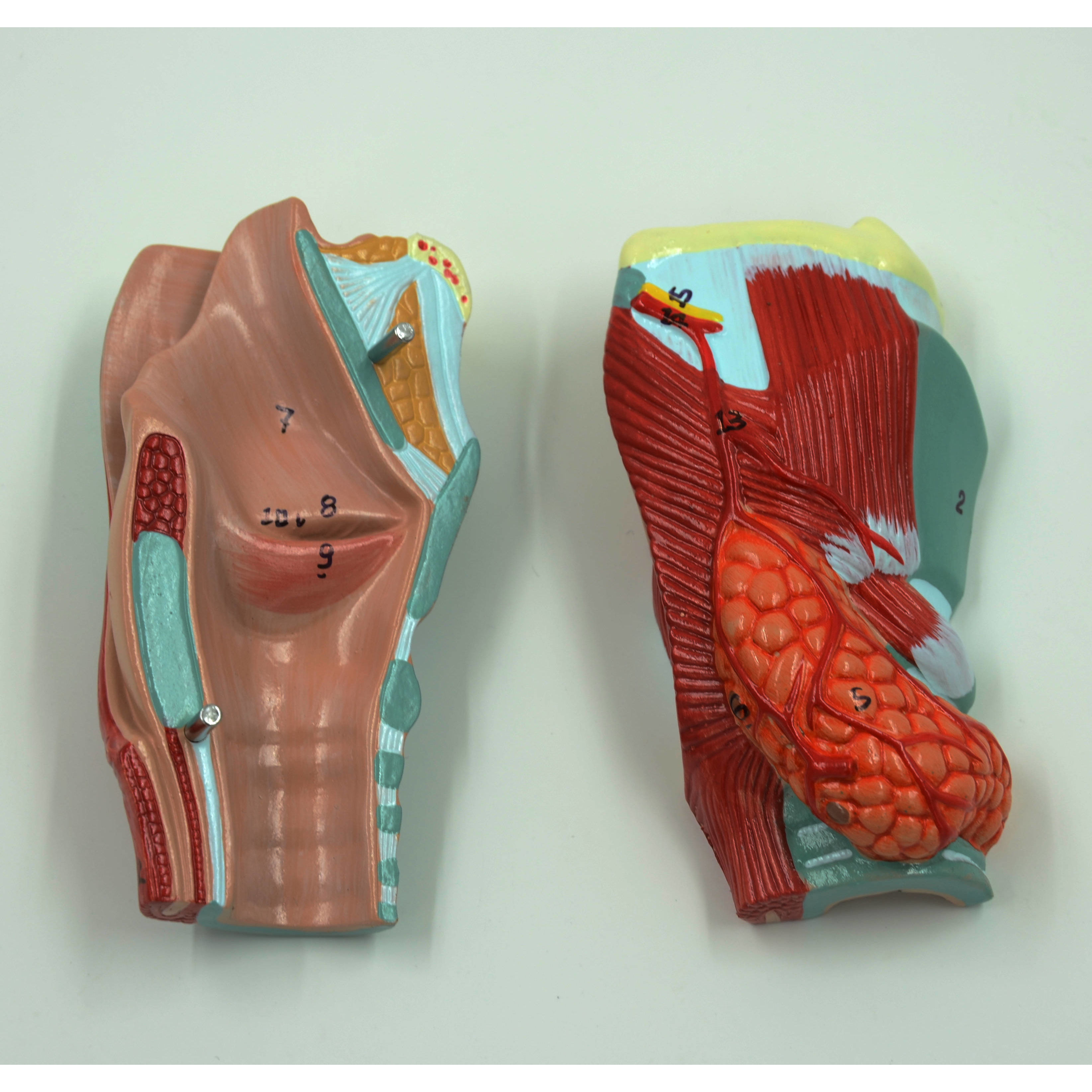 Модель в натуральную величину может быть разделена на 2 части, чтобы показать анатомию гортани человека и связанных с ней структур: подъязычной кости, хрящей, связок, мышц, сосудов, нервов и щитовидной железы.