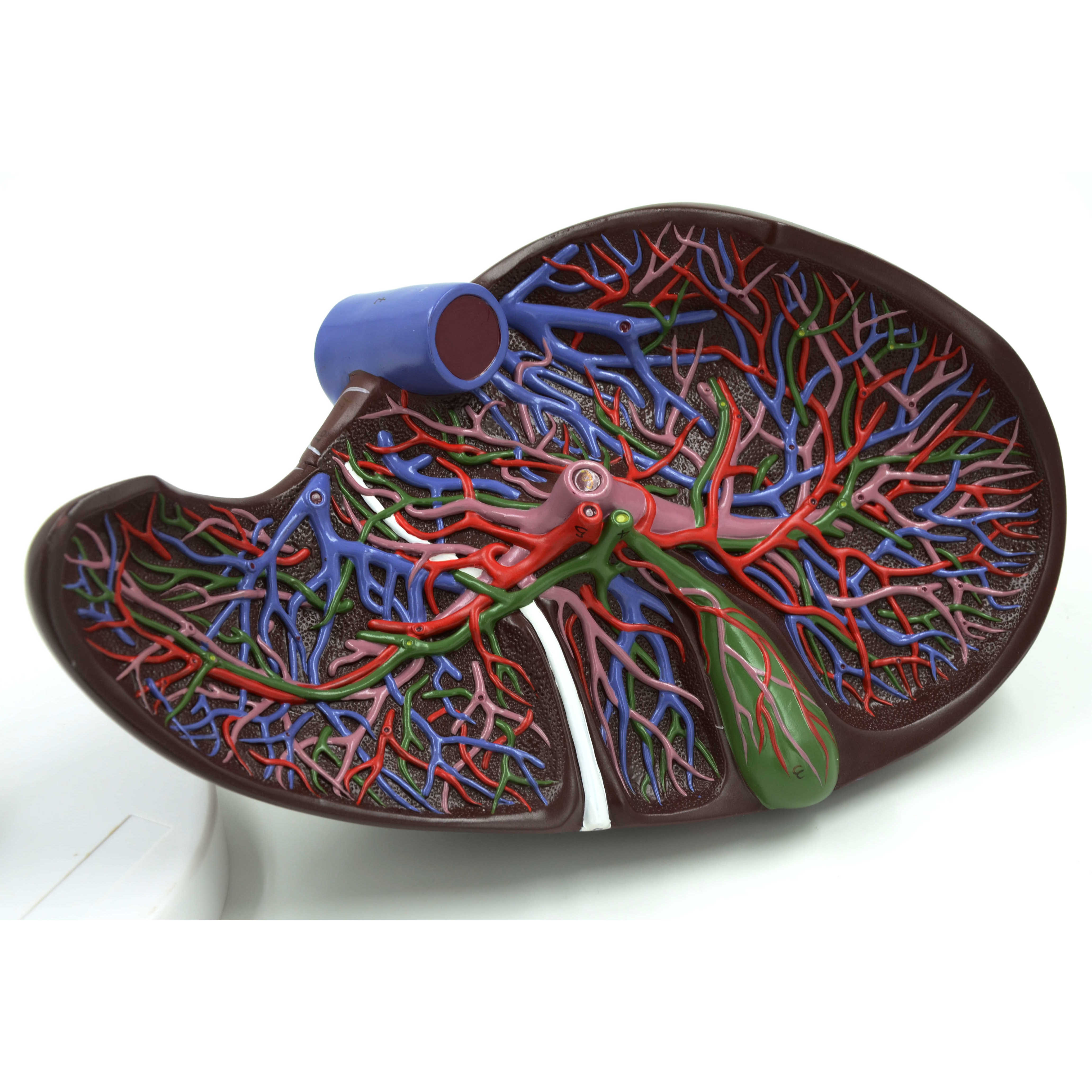 Модель, увеличенная в 1,5 раза от натуральной величины, демонстрирует печень и желчный пузырь в открытом сечении со сложной сетью сосудов и желчных протоков, выделенных разными цветами для наглядности.